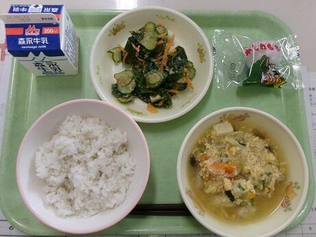 今日の給食:麦ごはん、高野豆腐の卵とじ、いかの酢味噌あえ、かしわ餅、牛乳