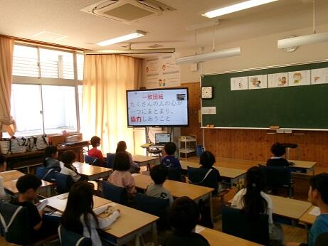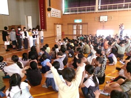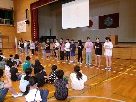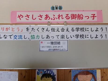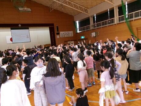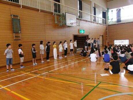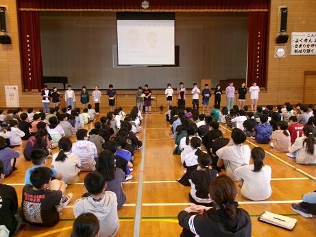 1年生を迎える会です。計画委員会が進めてくれました。「選択クイズ」や、「心を一つにあっちむいてホイ」などを行いました。1年生がとても喜んでくれました。