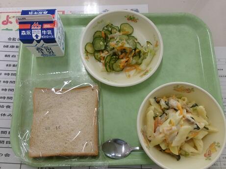 今日の給食:黒糖パン、ペンネのクリーム煮、ナッツサラダ、牛乳
