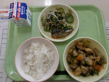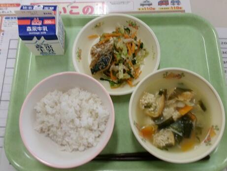 今日の給食:麦ごはん、さばのごまだれ焼き、おかかあえ、牛乳