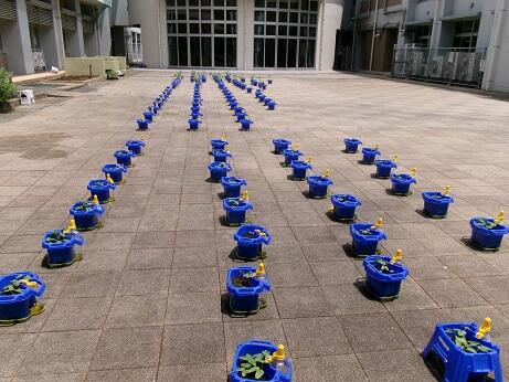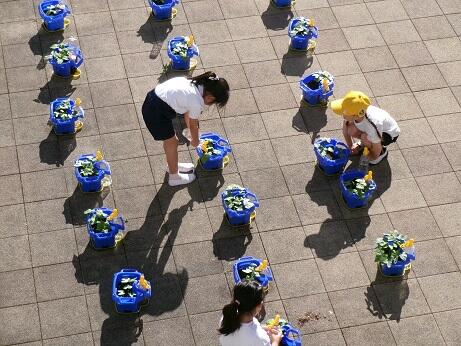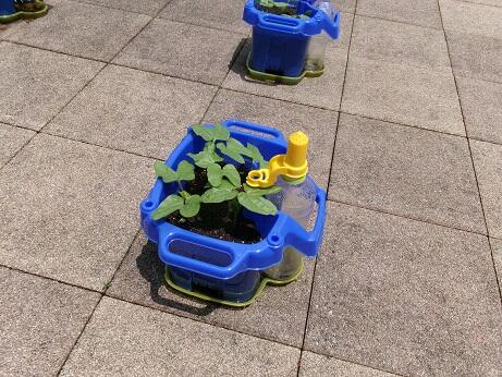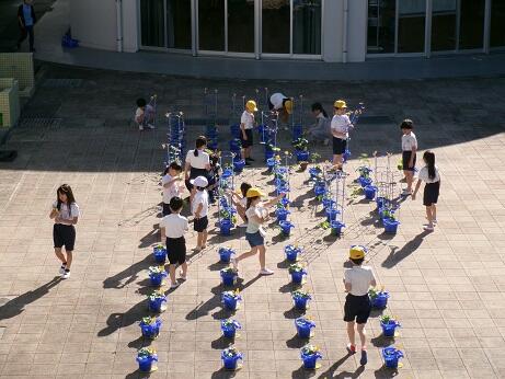 1年生は毎朝、あさがおのお世話をしています。今日は水やりとともに、あさがおの支柱をたてていました。