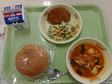 今日の給食:丸パン、ミネストローネ、コロッケ、野菜サラダ、牛乳