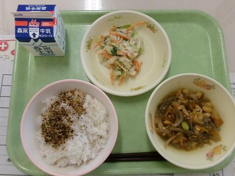 今日の給食:麦ごはん、大豆の磯煮、御船川とささみのサラダ、手作りふりかけ、牛乳