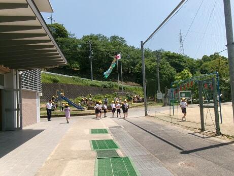 先日、1年生がこいのぼりを作りました。五月の空に、気持ちよさそうに泳いでいます。