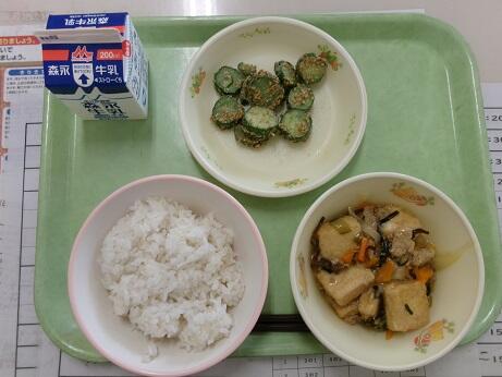 今日の給食:麦ごはん、豚肉の中華煮、カリカリきゅうり、牛乳