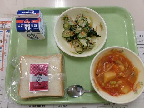 今日の給食:食パン、鶏肉のトマト煮、わかめとツナのサラダ、大豆チョコクリーム、牛乳
