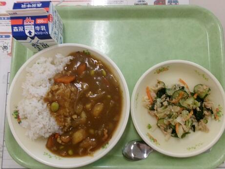 今日の給食:チキンカレーライス、わかめとツナのごまサラダ、牛乳