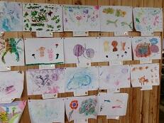 【1年生教室横には、見学旅行の写真や御船小1学期からの行事等の写真が掲示してあります。】