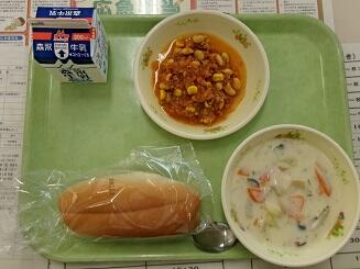 今日の給食:セルフドッグ、きのこシチュー、チリコンカン、牛乳