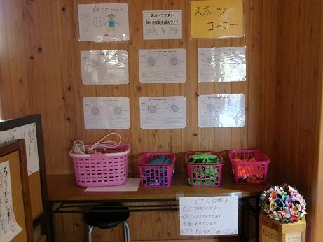 【事務室前に作られているスポーツコーナーです。スポーツテストの結果。児童用ビブス置き場。】
