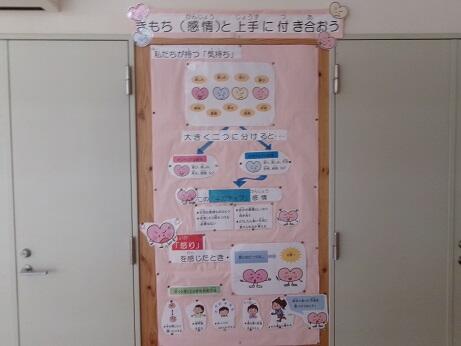 【職員室前です。人権に関するポスター、習字、標語が掲示してあります。】