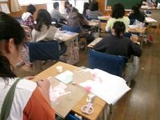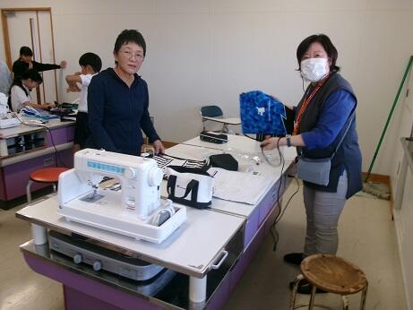 【5年2組のミシンを使った、ナップサック作りです。ミシンボランティアの皆様に協力して頂いています。ありがとうございます】
