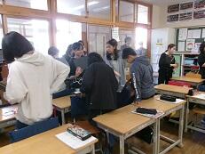 【5年2組は理科で「ふりこの性質」を学習していました。ひもの長さを変え、ふりこの周期などを計測していました。】