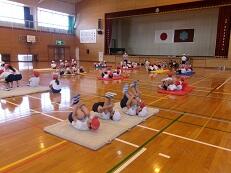 【2年生は、マット運動で、ゆりかごを練習していました。】