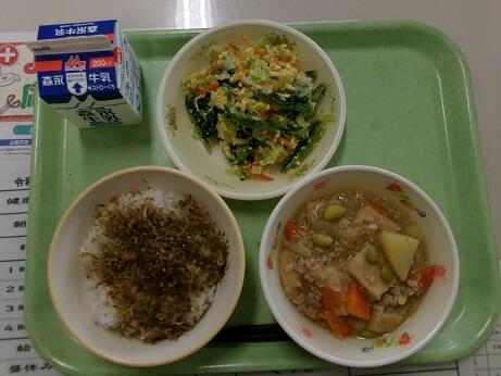 今日の給食:麦ごはん、豚じゃが、ごぼうサラダ、手作り佃煮、牛乳