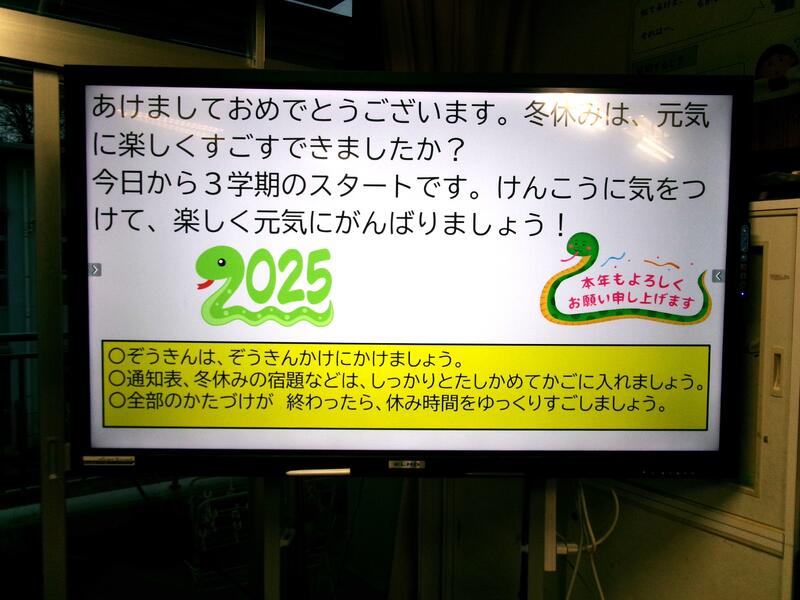 今日は1月7日です。明日8日(水)は3学期始業式がおこなわれます。現在、全国的にインフルエンザが流行しています。感染防止や低気温などの理由で、始業式は体育館に集まらず、ZOOM(ズーム)をつかってオンライン配信でおこないます。給食なしで児童は、11時10分から11時25分の間に下校します。9日(木)、10日(金)は4時間授業で、給食があります。13時10分から13時30分の間に下校する予定です。よろしくお願いします。