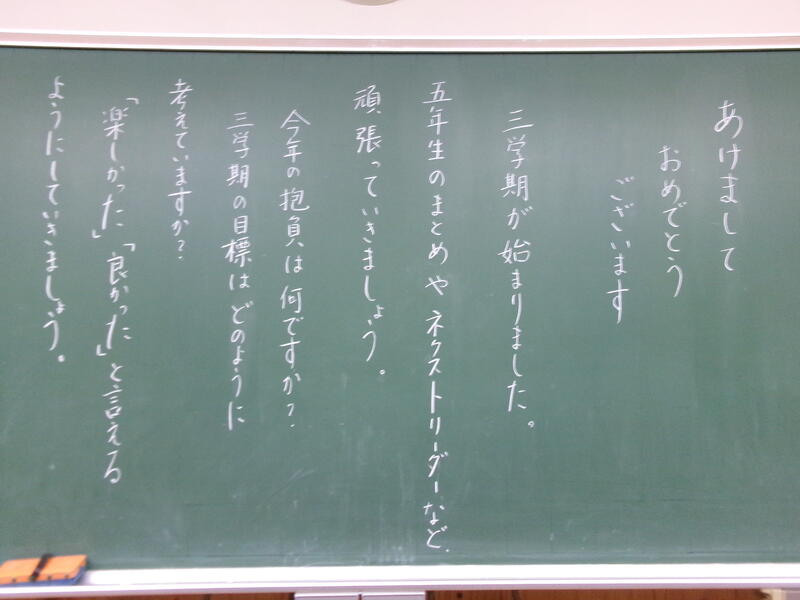 1月は「行く」、2月は「逃げる」、3月は「去る」と言われるように、3学期は時が経つのがはやく感じられます。2学期の授業日数は約80日、3学期の授業日数は約50日です。各学年のまとめをおこなうとともに、6年生は中学1年生に、1年生から5年生までは、次の学年へ向けての離陸(りりく)準備の時期でもあります。目標をたて、少しでもそれに近づくように、日々努力をしていくことが大切ですね。