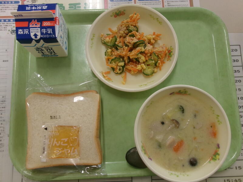 今日の給食:食パン、ウィンナーとじゃがいもの豆乳スープ、にんじんサラダ、りんごジャム、牛乳