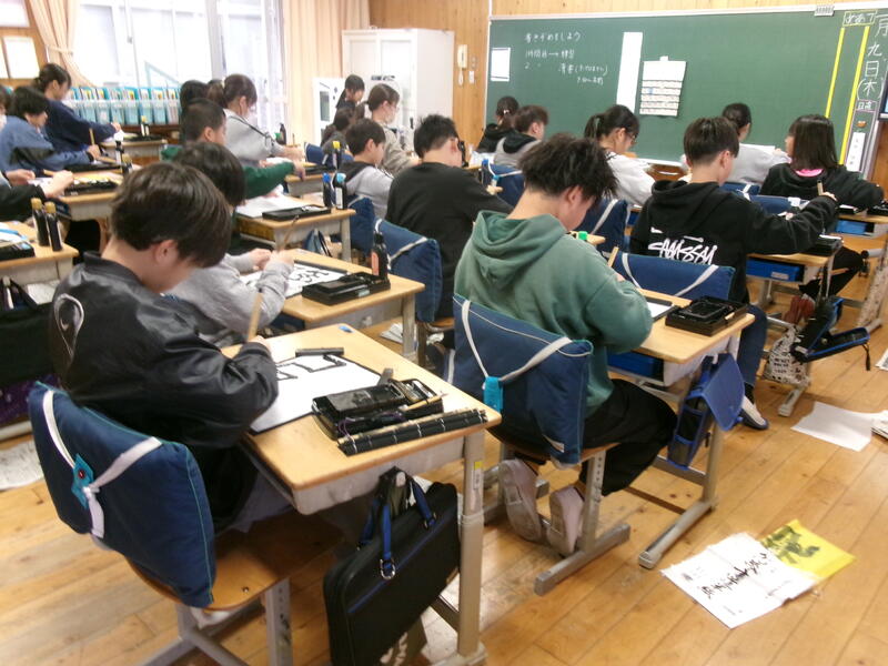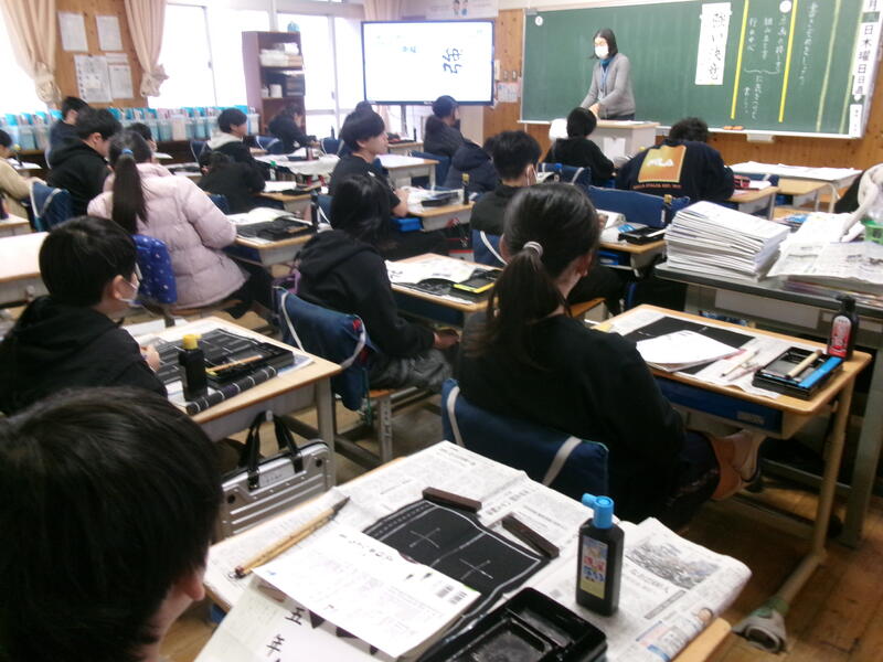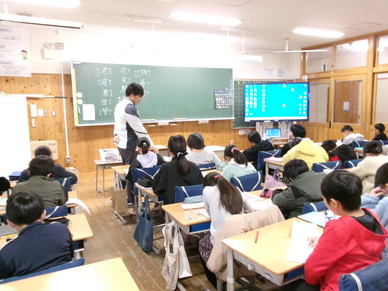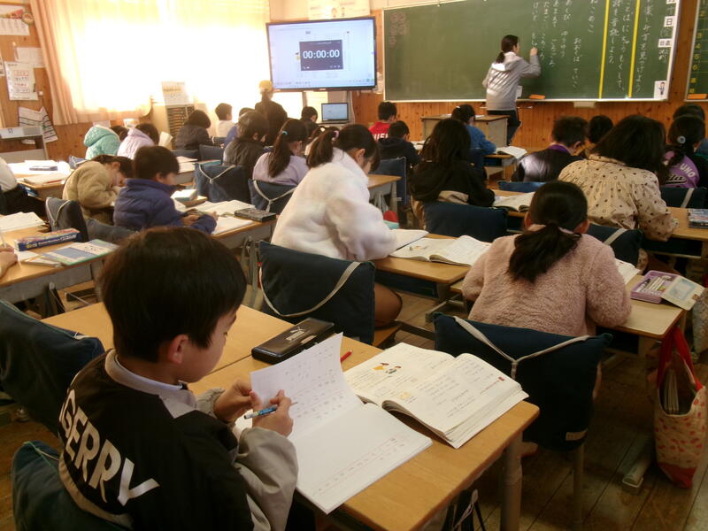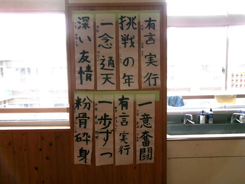 【今日は4年生と6年生が書初めに取り組んでいました。自分で好きな四字熟語を選び書いていました。映像は4年1組と6年1組です。】