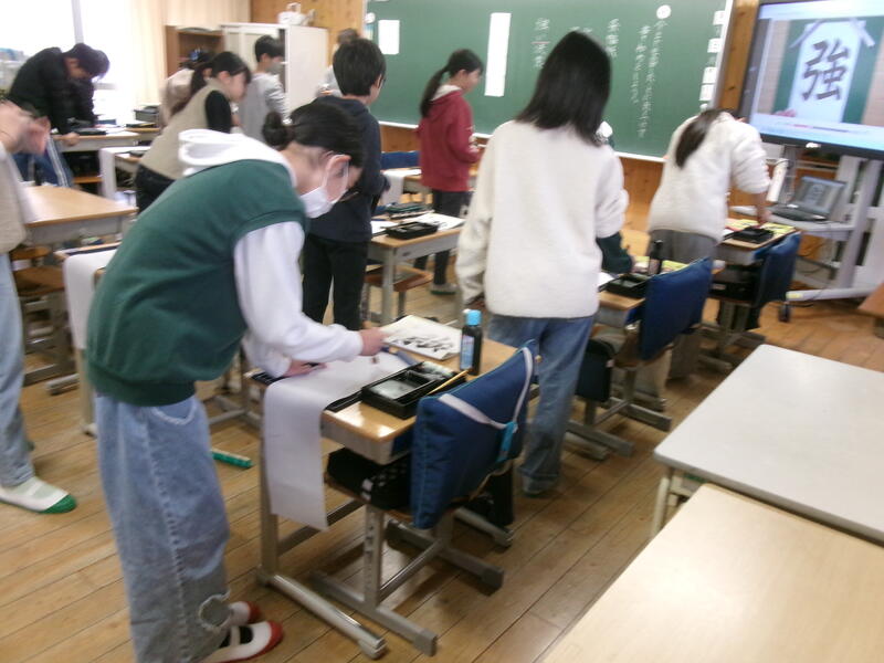 5年生は全クラス、書初め「強い決意」にチャレンジしていました。