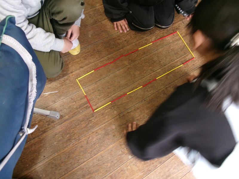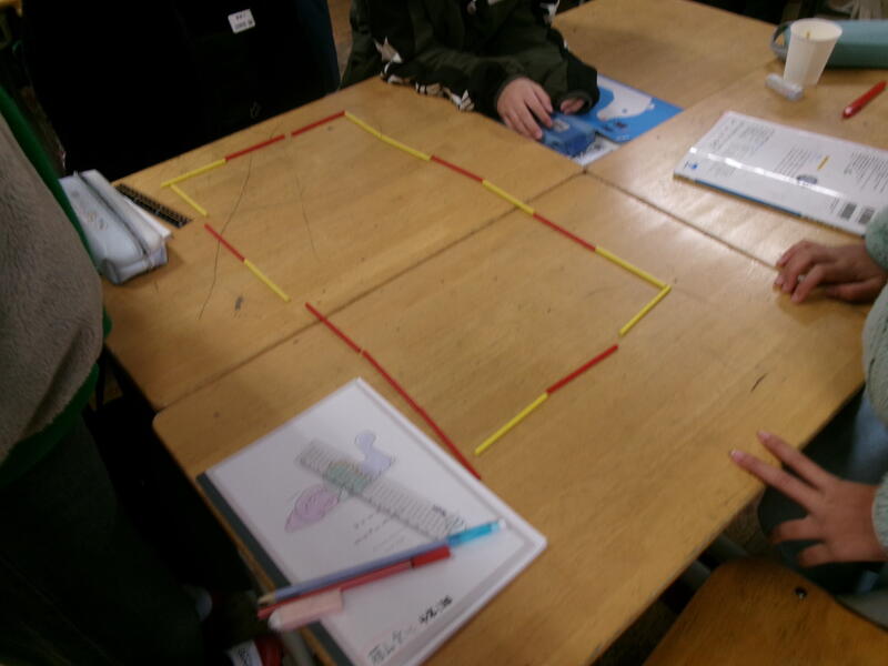 4年生の算数です。2校時目、3校時目です。 「変わり方調べ」をしています。18本の棒を全部使って、様々な形の長方形をつくり、たての本数と横の本数の関係を、表をつかって調べました。