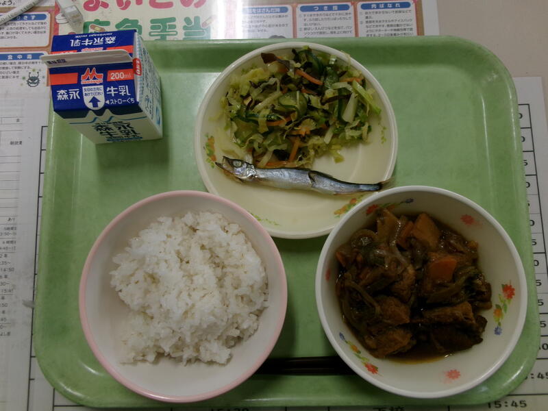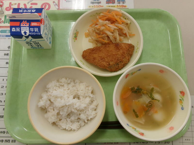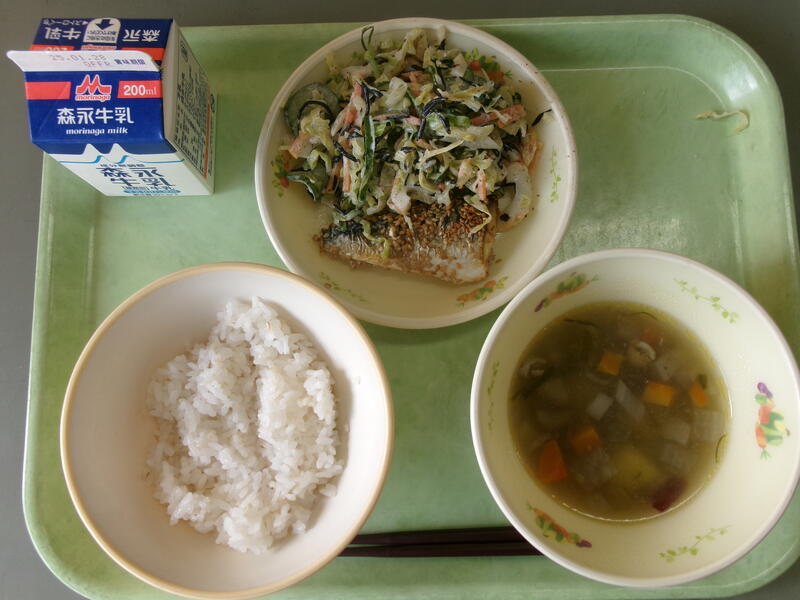 今日の給食:ごはん、さつま汁、鮭の塩焼き、昆布あえ、牛乳