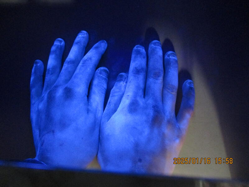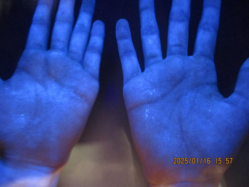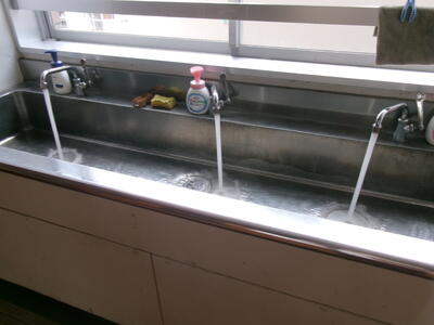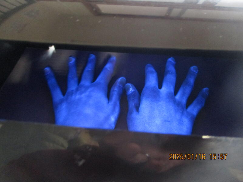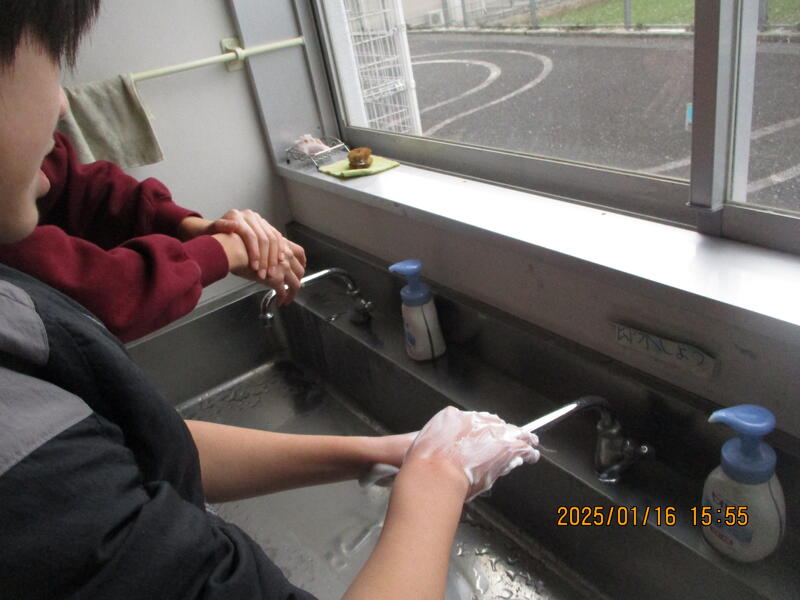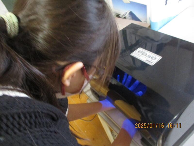 昨日(1月16日)の委員会活動のとき、保健委員会は、手洗いの実験をおこないました。石鹸をつかい、しっかり手を洗いました。その後装置をつかって、洗い残しがないか調べました。しっかり洗っているつもりでも、指と指の間やつめのところなど、洗い残しがみつかりました。全国的にインフルエンザが流行しています。手洗いや換気をしっかりやっていきましょう。