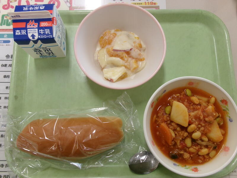 今日の給食:ミルクパン、大豆とひき肉のトマト煮、フルーツヨーグルト、牛乳