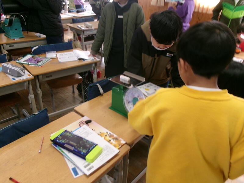 【3年生は、算数で重さの学習をしています。今日は、台ばかりで様々な物をはかり、目もりの読み方を学習しました。】