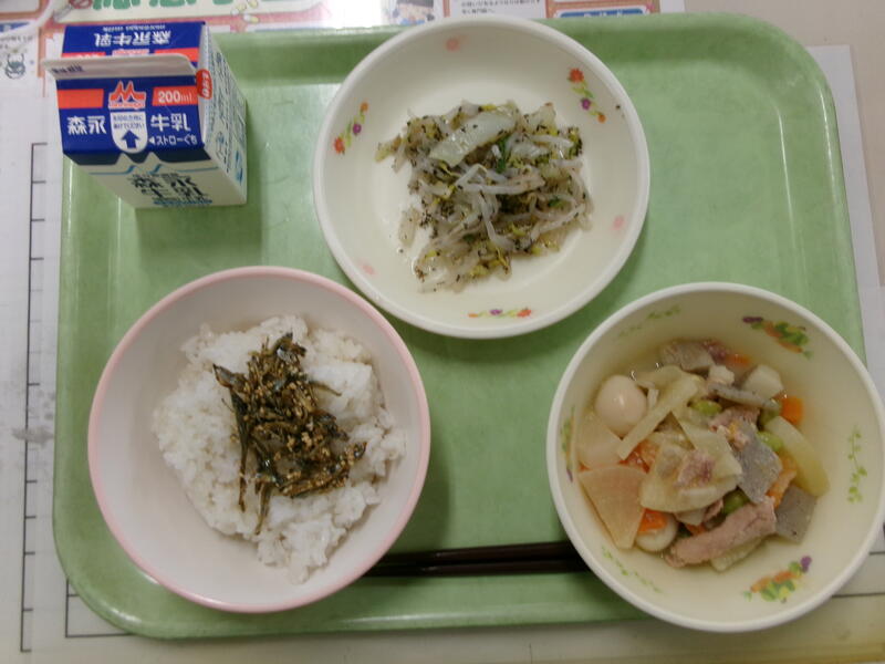 今日の給食:麦ごはん、雑煮、ブリフライ、紅白なます、牛乳