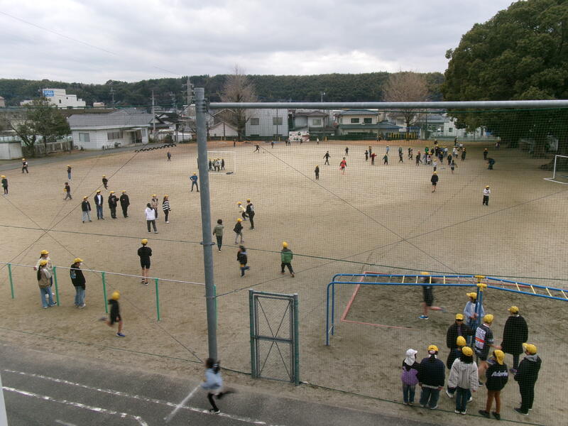 【昼休みの様子です。寒い中、運動場では、多くの子どもたちが走り回っています。】
