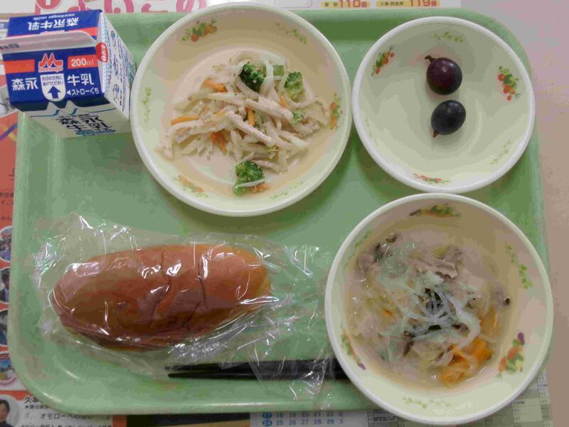 今日の給食:ミルクパン、タイピーエン、大根サラダ、益城のぶどう、牛乳