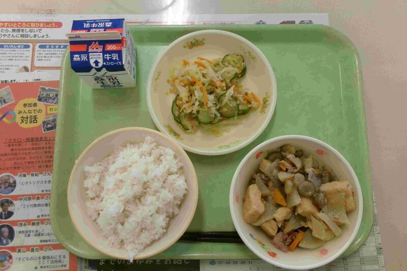今日の給食:麦ごはん、五目肉じゃが、ごぼうサラダ、ムース、牛乳