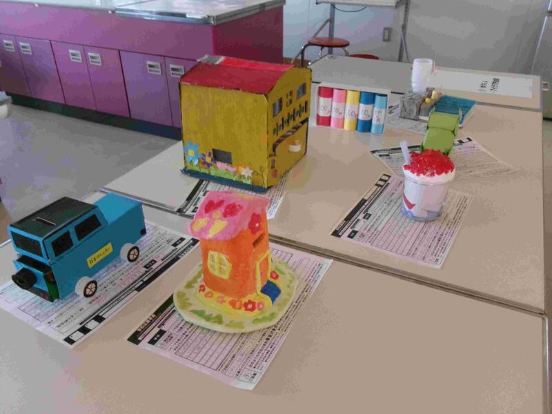 【児童玄関前に「ゆうちょアイデア貯金箱」出品作品を展示しています。現在の参加方法は、貯金箱を写真に撮り、電子データーで送るようになっています。11月下旬に審査発表があります。それまでは、学校で責任を持って保管しておきます。】