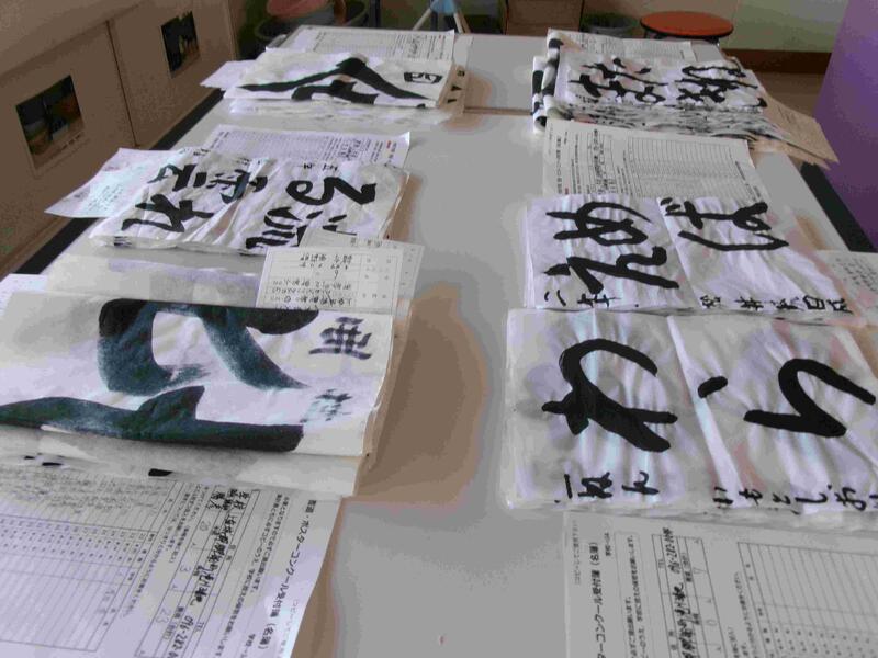 【夏休み作品募集の係をしています。たくさんの作品がでました。御船小の子どもたち、頑張っています。今日はJAさんに、習字とポスターを持って行きました。】