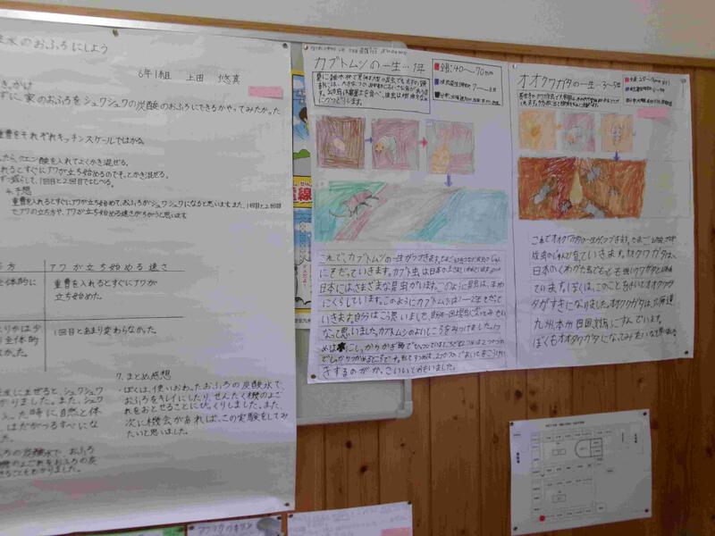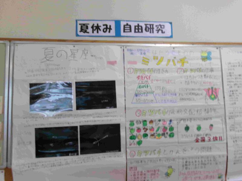 【理科室前には理科の夏休み自由研究が掲示してありあす。よくがんばっています。】