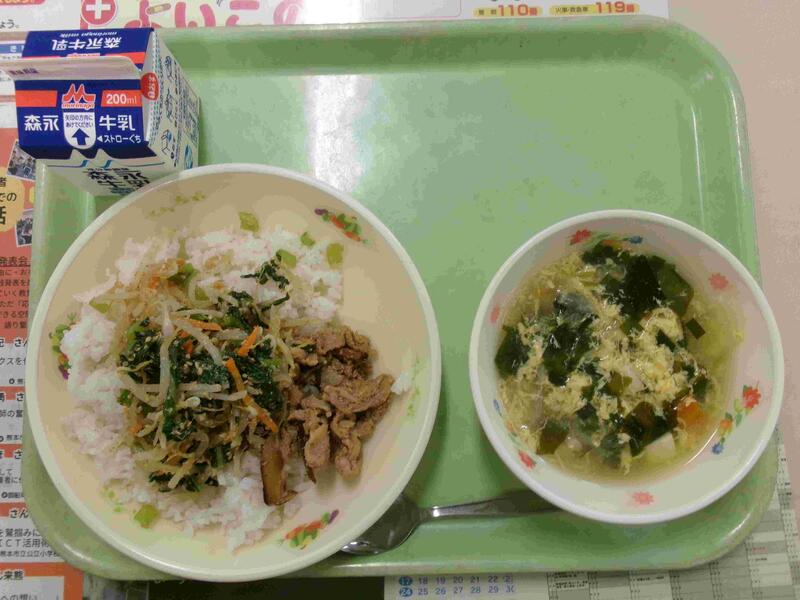 今日の給食:ビビンバ、わかめと卵のスープ、豚肉の甘辛煮、ナムル、牛乳