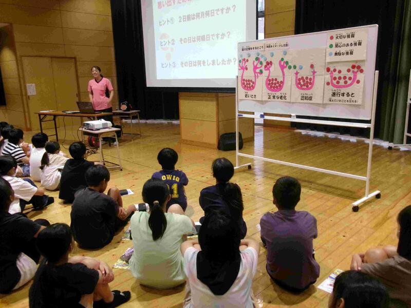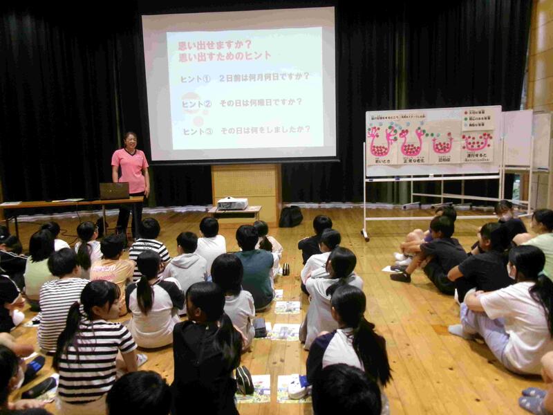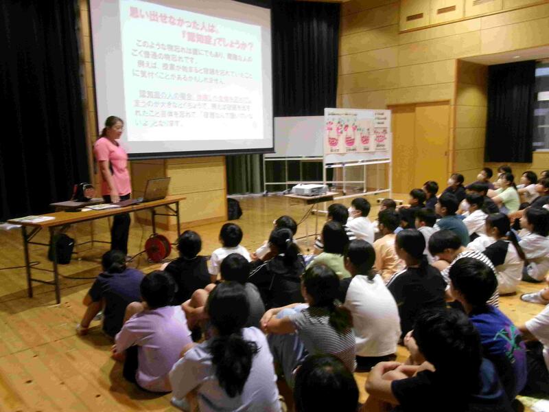 【3校時目、6年生は交流ホールで「認知症サポーター養成講座」の学習をしました。講師には御船清流園の方に来校していただきました。認知症の状態や、認知症の方にどのように接すればよいかなどを学習しました。一番いい接し方は一緒に笑うということです。6年生の保護者の皆様は、どういう学習内容だったか、子どもさんに聞いてみてください。】
