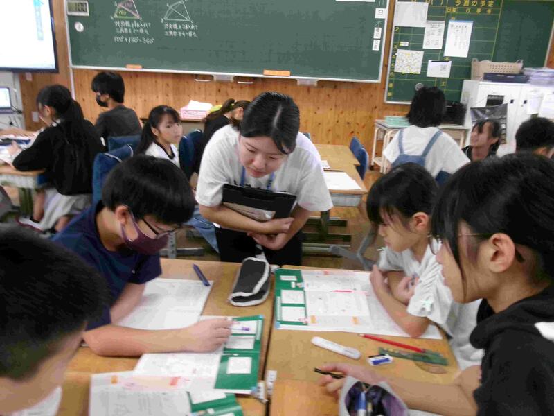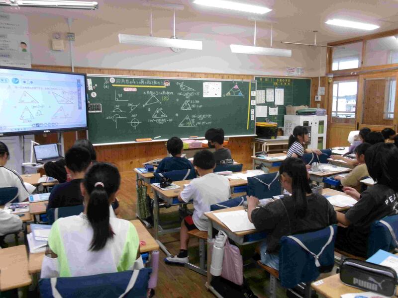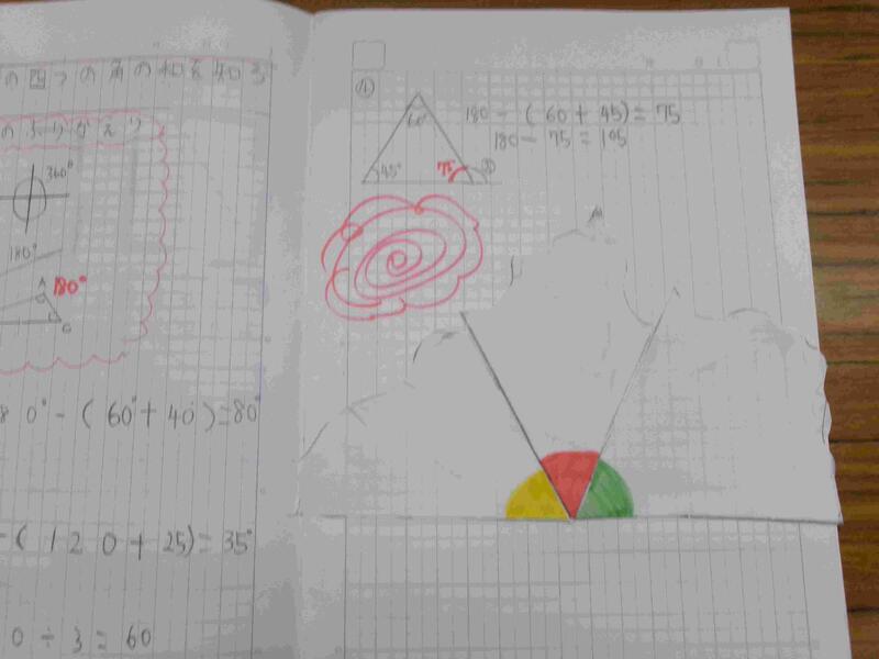 【5年生の算数です。「図形の角」を学習しています。今日は三角形の3つの内角の和はどんな三角形でも180度になることを、操作活動を通して確かめました。】