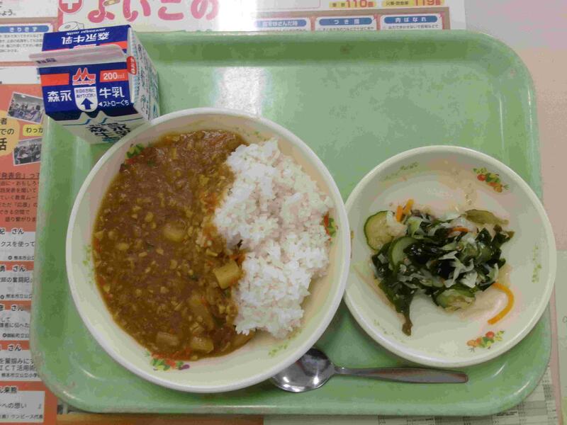 今日の給食:キーマカレー、海藻サラダ、牛乳