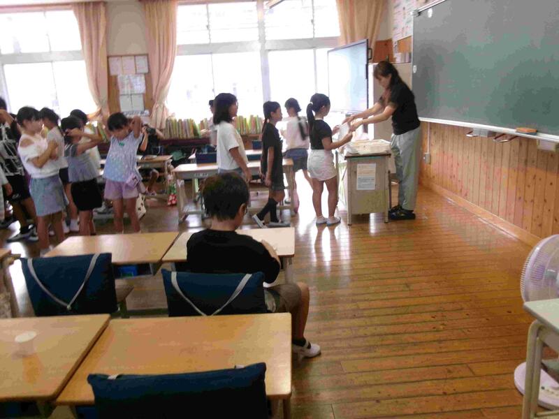 毎朝児童靴箱のところで挨拶をしています。多くの児童が話をしてくれます。今日は27日(土)におこなわれた、御船町花火大会のことや、こんな出店があったことなどを話してくれました。また、昨日お父さんの誕生日のとき、たぬきのケーキを食べた話などもしてくれました。