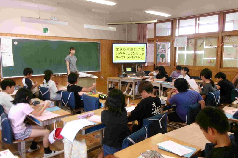【4年2組は国語で、家族や友達に工芸品のみりょくを伝えるリーフレット作りの準備をしていました。】