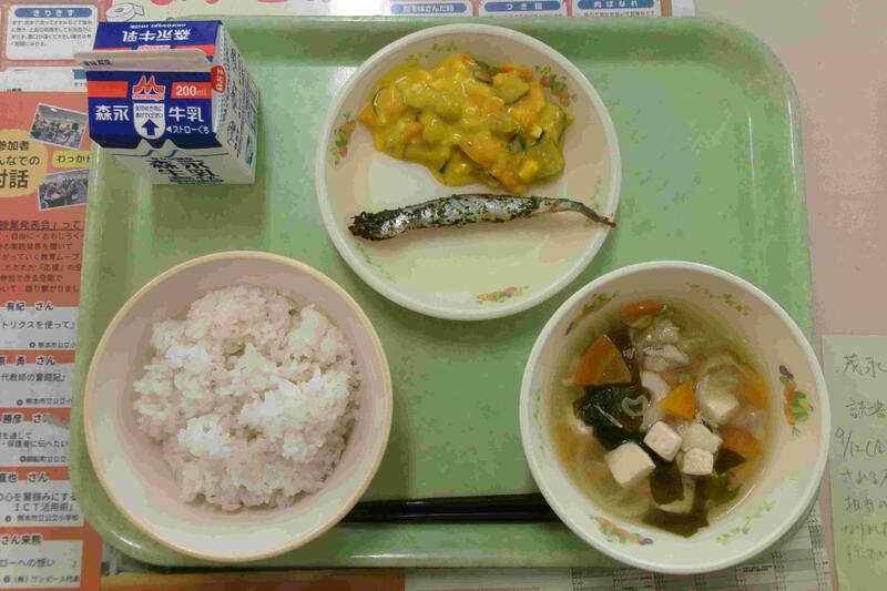 今日の給食:麦ごはん、豆腐汁、青のりししゃも、かぼちゃと豆のサラダ、牛乳
