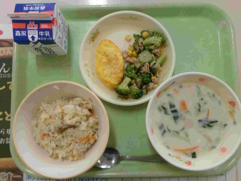 今日の給食:(ふるさとくまさんデー、ゆうきのうぎょうの日)キャロットライス、じゃがいものミルクスープ、オムレツ、ツナとブロッコリーのサラダ、牛乳