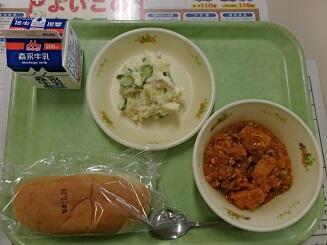 今日の給食:コッペパン、厚揚げのミートソース煮、ダブルポテトサラダ、牛乳