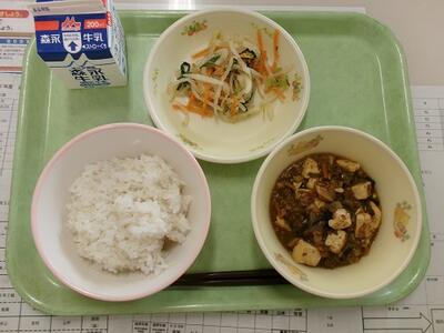 今日の給食:麦ごはん、マーボー豆腐、もやしのナムル、牛乳