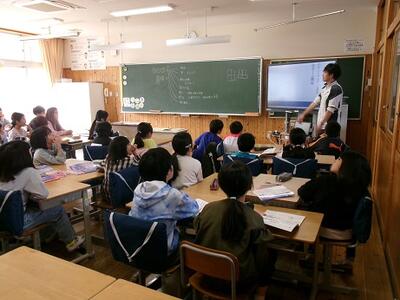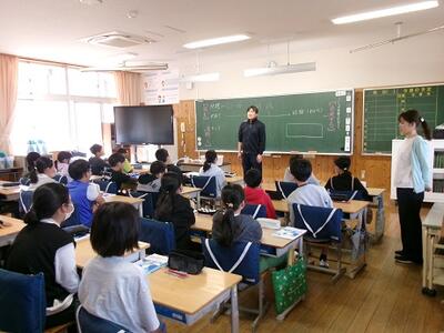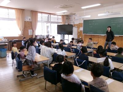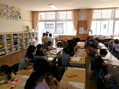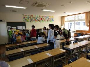 今日は、1年生は、はじめての、1人での登校です。登校班の5年生、6年生児童が、手をひいて登校していました。また、教室では6年生が、道具の入れ方や、ランドセルの置き方を教えていました。6年生のみなさんありがとう。