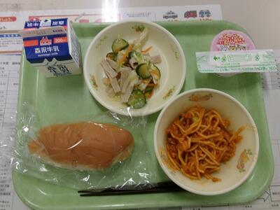 今日の給食:ミルクパン、スパゲッティミートソース、ハムサラダ、お祝いゼリー、牛乳
