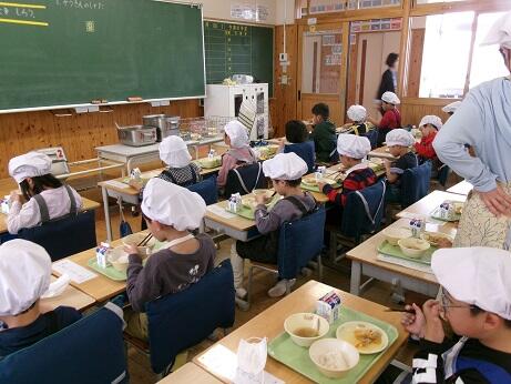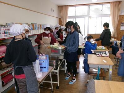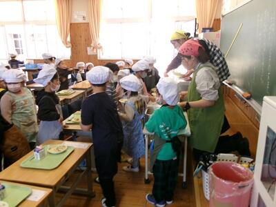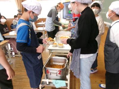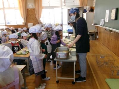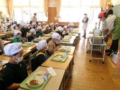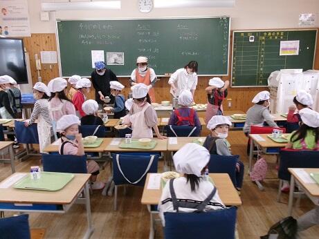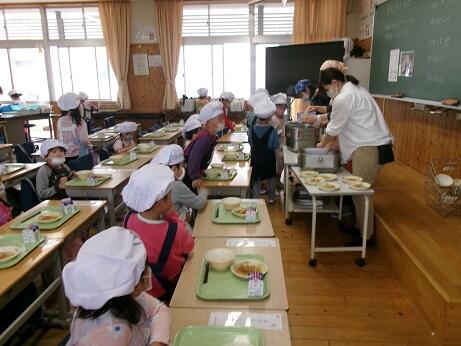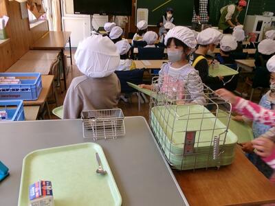 1年生、はじめての給食です。準備から片付けまでとても上手でした。