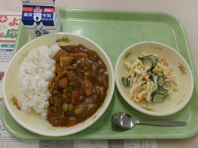 今日の給食:カレーライス、マカロニサラダ、牛乳
